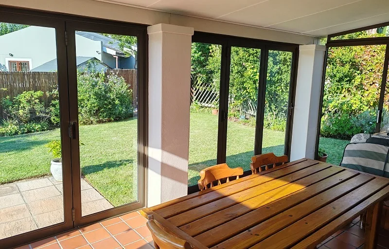 Then, there’s the outside. You’ve got a very nice place to sit in the mornings and catch a little sun, with glass doors covering the area. Outside, there’s a BBQ and a real garden atmosphere.